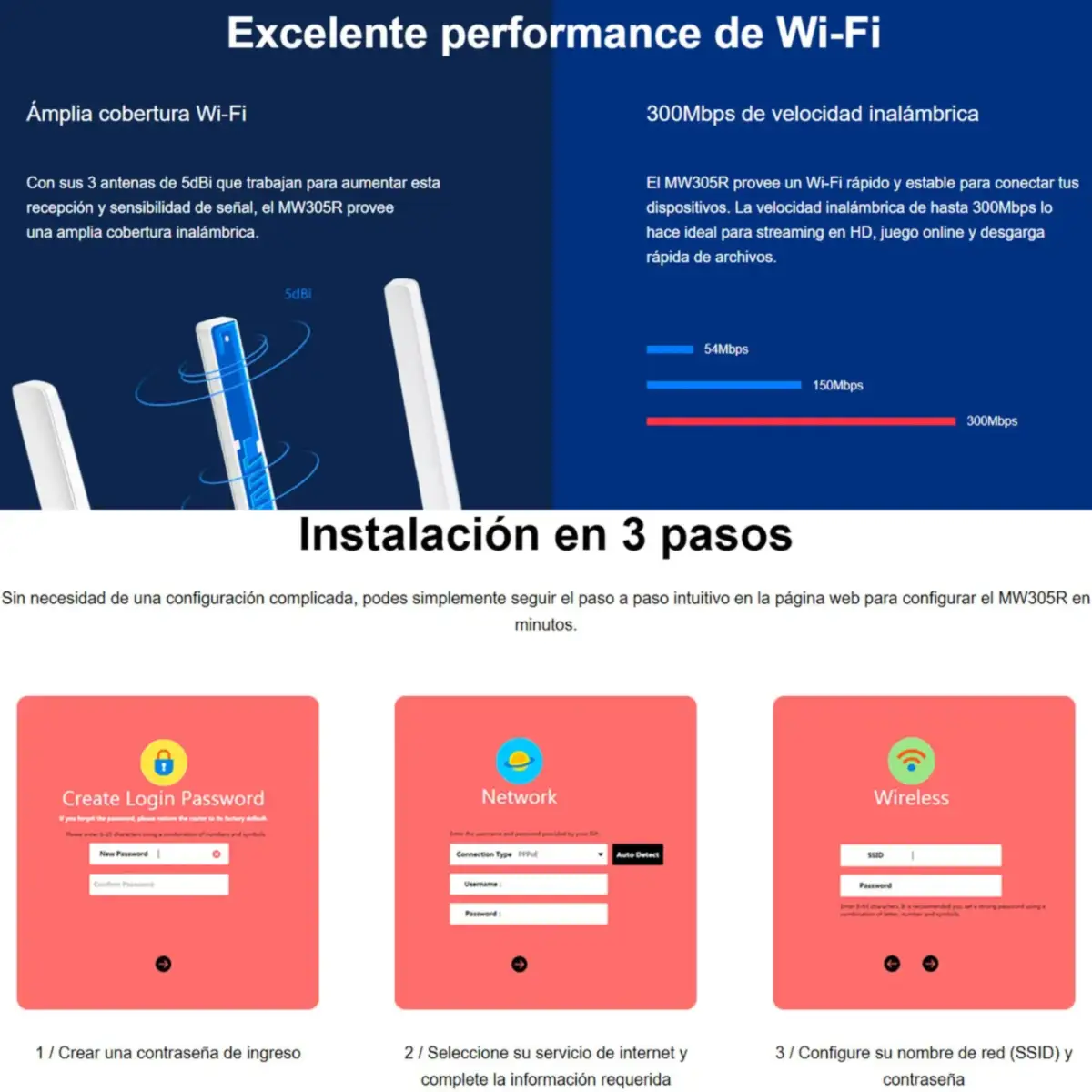 Modelo / Numero de parte: MW305R EAN / UPC: No disponible Codigo AndesPC: 0509023 Descripcion del producto: 4 en 1: ROUTER / ACCESS POINT / REPETIDOR / WISP Router Inalambrico N 300Mbps Mercusys modelo MW305R. Las tres antenas de 5dbi incrementan y hacen mas estable la senal Wifi. Pagina de configuracion intuitiva que en minutos guia al usuario en el procesos de setup inicial. Caracteristicas principales - Dimensiones: 169 x 116 x 35 mm - Boton de Reset y WPS - External Power Supply: 5V/0.6A - Antennas: 3 de 5dBi Omni Direccionales Fijas - Ethernet Ports: 3 x 10/100Mbps LAN Ports y 1 x 10/100Mbps WAN Port. - Frecuencia: 2.4 GHz - Potencia de transmision: 20dBm - Funciones inalambricas: WDS bridge - Gestion Parental - Control de Accesos - Management Local y Remoto DHCP - Seguridad Firewall: IP and MAC address binding - Funcion de Red de invitados a 2.4GHz - EAN: 6957939000400 (Idem 0501026) |