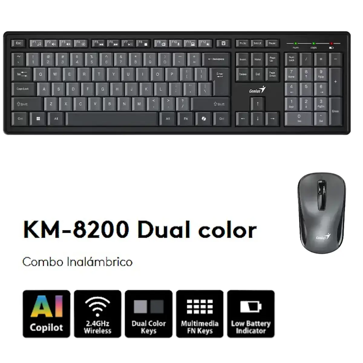 Modelo / Numero de parte: KM-8200 EAN / UPC: 4710268256199 Codigo AndesPC: 1103037 Descripcion del producto: Es un teclado personalizable. Junto con el Motor Inteligente Genius, proporciona un control completo de las 12 teclas de funcion exclusivas para web, aplicaciones, redes sociales o integracion de negocios. Caracteristicas principales: Frecuencia RF 2.4 GHz. Teclas de Funcion Personalizables F1 a F12. Soporte SmartGenius Si, descarga de la aplicacion SmartGenius en:Download. Barra Virtual de Teclas de Funcion: SI Soporte de Perfil de Aplicaciones: SI Teclas de funcion: SI Unidad de sensor (Mouse) optico. Mouse Resolucion (DPI) 1000. Cantidad de botones del mouse Tres (izquierda, derecha y central con desplazamiento). Dos baterias AAA para el teclado. Una AA para el mouse. Dimensiones (A x A x P). Teclado: 446.40 x 133.31 x 23.25 mm (17.57 x 5.25 x 0.92 pulgadas). Mouse: 97 x 55 x 35 mm (3.82 x 2.17 x 1.38 pulgadas). Compatible con sistema operativo Windows 7 o superior y Mac OS X 10.8 o superior. EAN: 4710268256199 |